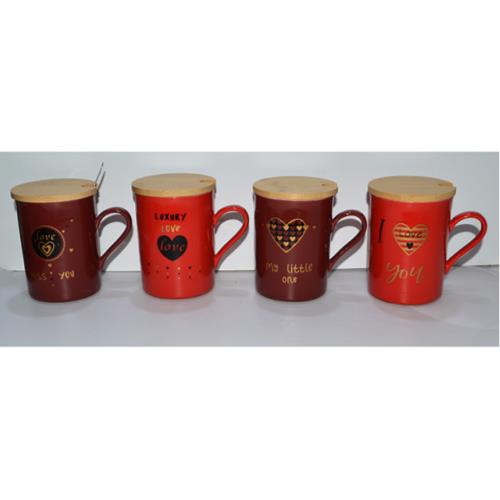 CERAMIC MUG W/WOODEN LID & SS SPOON ASST 7.5X10.2CM