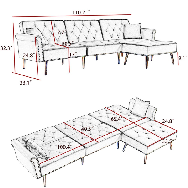 Upgrade your space with a sleek, multifunctional sectional designed for comfort and versatility. Featuring a reversible ottoman and modern L-shaped layout, it easily converts into a sleeper—perfect for guests or everyday lounging. Overall Size: 110.2" W x 33.1" D x 32.3" H