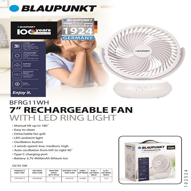 BLAUPUNKT 7" RECHARGABLE FAN WITH LED RING LIGHT 3 SPEEDS