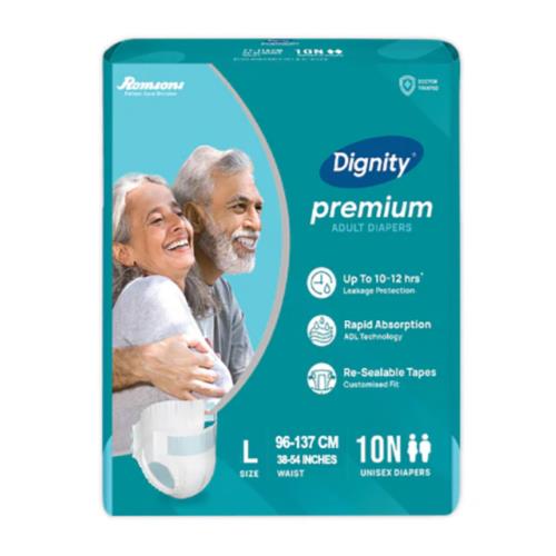 Dignity Premium is an open-style adult diaper with adjustable tabs that guarantee a customised fit to the wearer. With Leakage Protection Promise for up to 10-12 Hours, Dignity Premium is designed to contain urinary and faecal incontinence in both men & women.