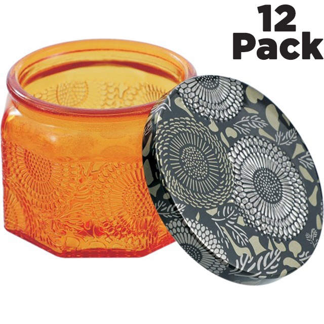 12PK EMBOSSED OCTAGON CANDLE JAR W/TIN LID 120ML/4OZ AMBER