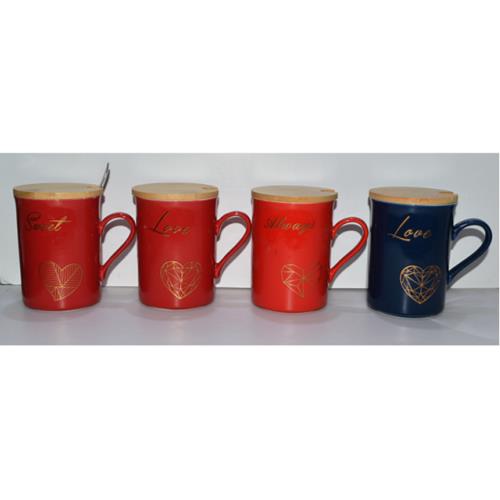 CERAMIC MUG W/WOODEN LID & SS SPOON ASST 7.5X10.2CM