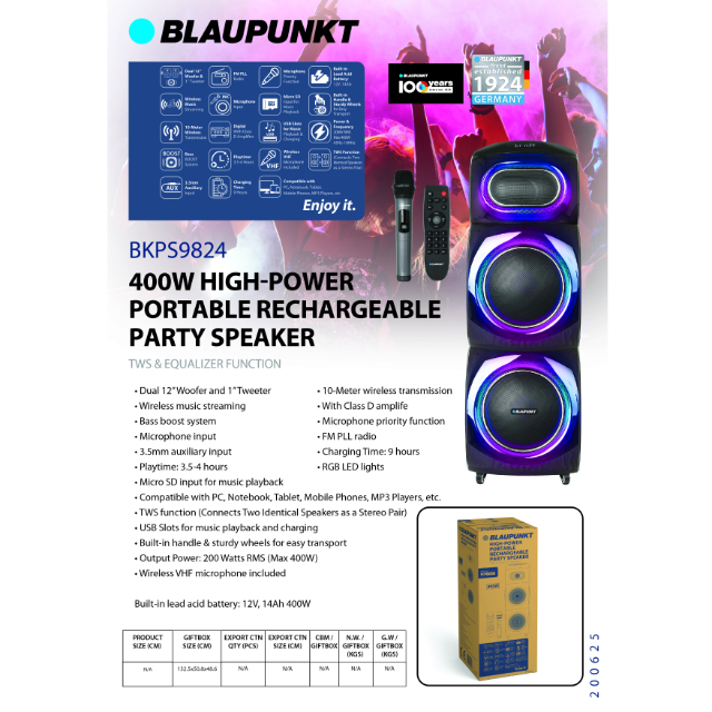 BLAUPUNKT 400W HIGH-POWER PORTABLE RECHARGEABLE PARTY SPEAKER
