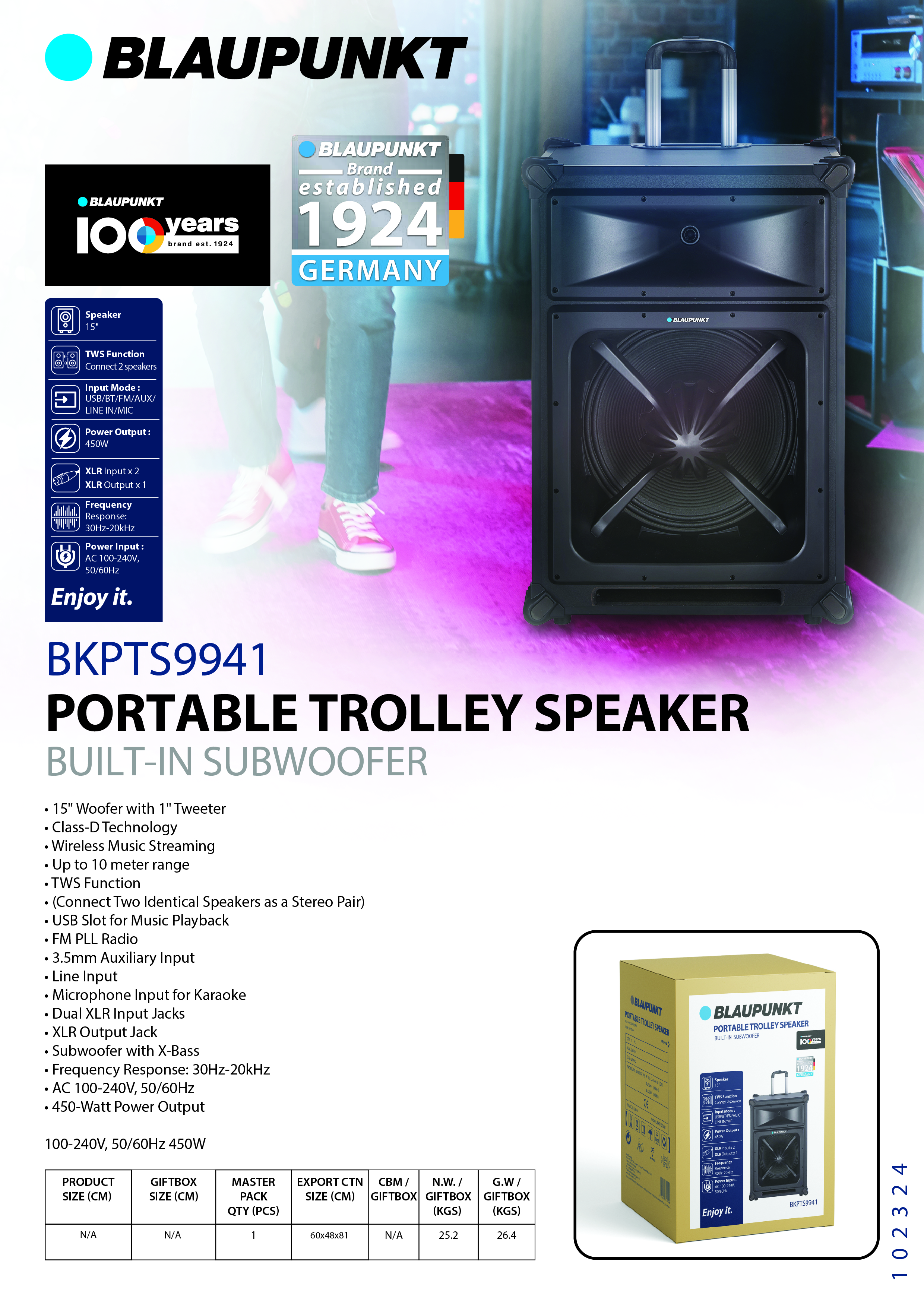 BLAUPUNKT 15" TROLLEY SPEAKER W/BUILT-IN SUBWOOFER 450W