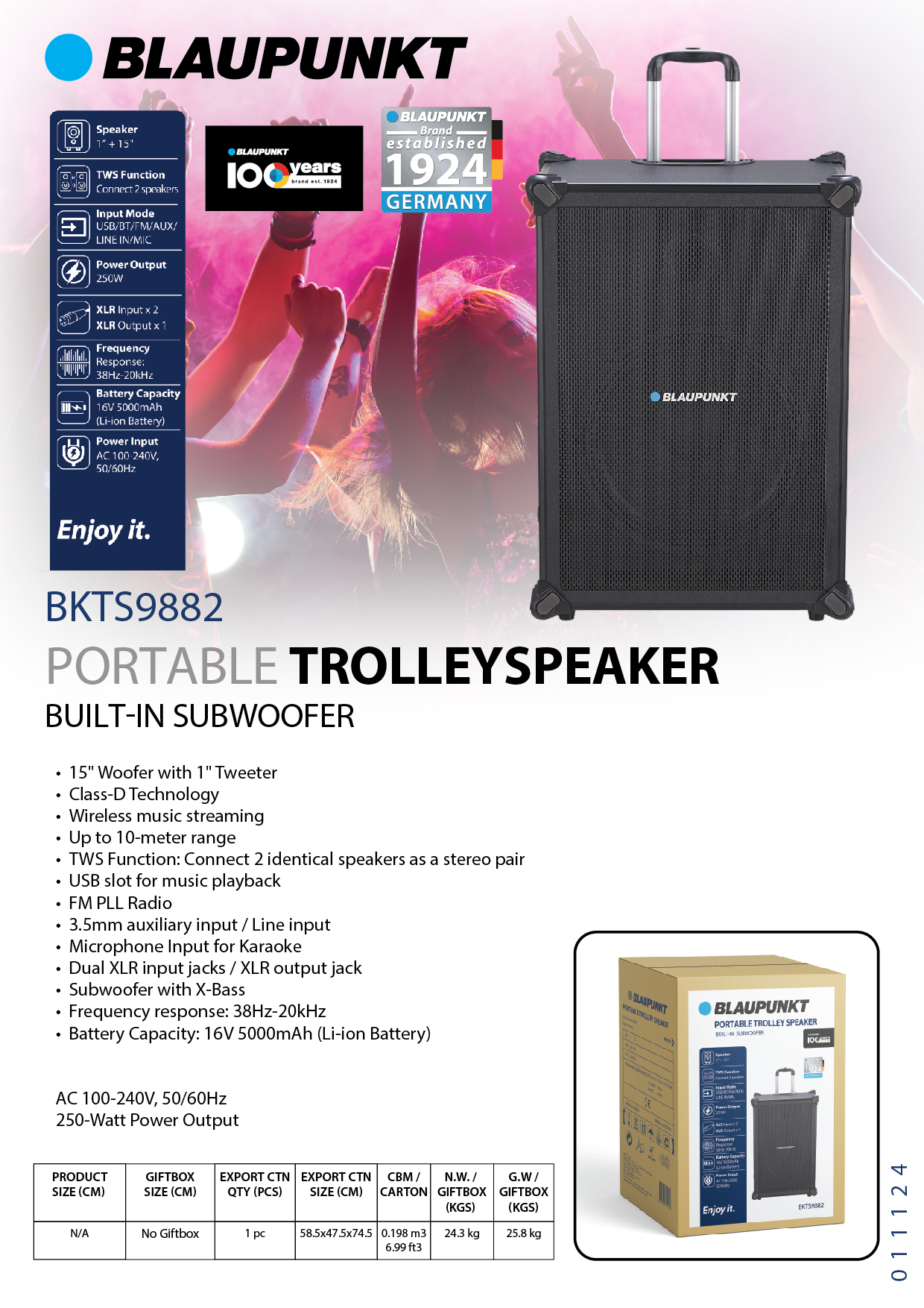 BLAUPUNKT 15" TROLLEY SPEAKER W/BUILT-IN SUBWOOFER 250W