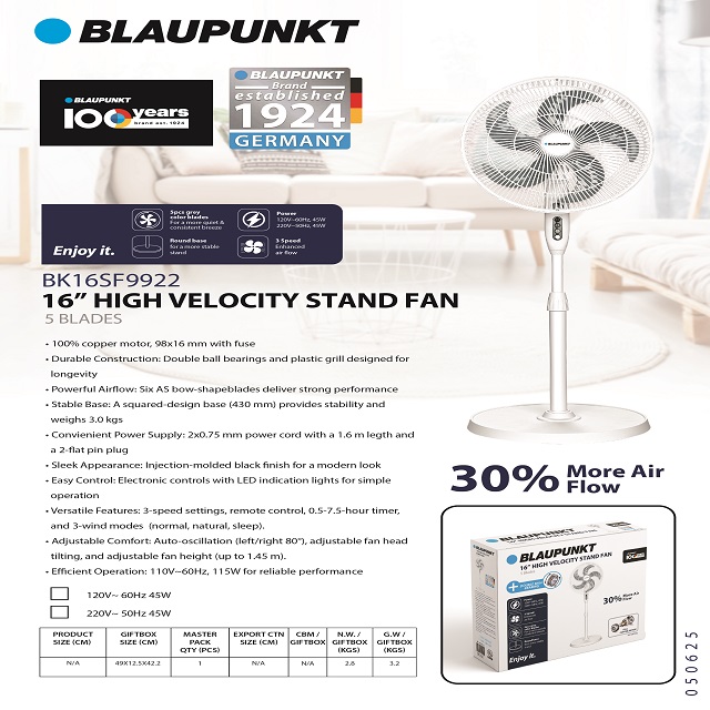 BLAUPUNKT 16 INCH HIGH VELOCITY FAN WHITE 45W ETL CERTIFIED