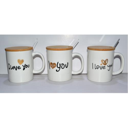 CERAMIC MUG W/WOODEN LID & SS SPOON ASST 8.5X9.3CM