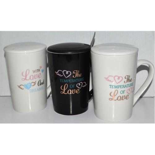 CERAMIC MUG W/CERAMIC LID & SS SPOON ASST 8x12CM