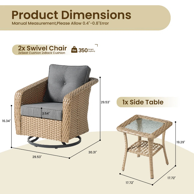 •Complete Set: Includes two swivel chairs (each with a 350 lbs weight capacity), two seat cushions, two back cushions, and one side table.