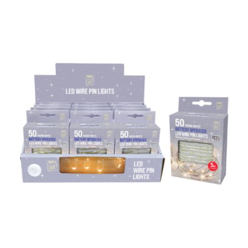 10cm Spacing | 5m Lit Length Requires 3 x AA Batteries (Not Included). On-Off with Static Glow. Transparent Batteries Compartment with Screw. 30cm Transparent Lead Wire. Silver Wire with 50 Warm White Wire Pin Lights.
