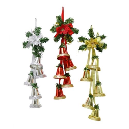 Bell 7.3x7.3x7cm, Total Height 55cm. Shiny Plastic Bellls with Glitter Trim, PVC Tisnel Tips on op of Each Bell, PVC Tinsel with Metallic Fabric Poinsettia, Metallic Ribbon Strings and Bow. 3 Colours Gold, Silver and Red with Matching Colour Glitter, Ribbon String, Bow and Hanger, Poinsettia.