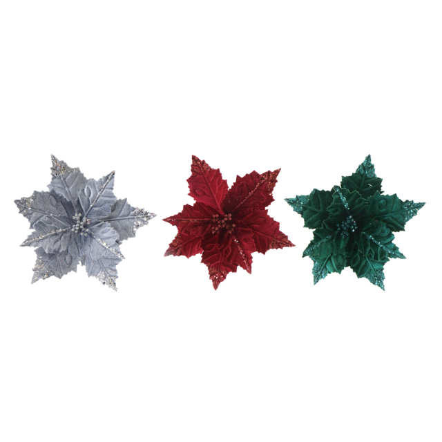 CLIP ON VELVET POINSETTIA W/SEQUINS 30CM ASST