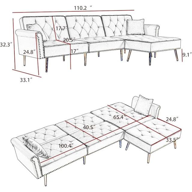 Upgrade your space with a sleek, multifunctional sectional designed for comfort and versatility. Featuring a reversible ottoman and modern L-shaped layout, it easily converts into a sleeper—perfect for guests or everyday lounging. Overall Size: 110.2" W x 33.1" D x 32.3" H